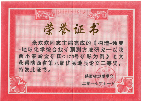 2017年11月21日,陜西省地質學會下發了《關于陜西省第九屆優秀地質成果、論文獎勵評選結果的通知》(陜地發[2017]09號),公布了陜西省第九屆優秀地質成果、論文獎勵評選結果名單,共計30個項目獲優秀地質成果獎、20篇論文獲優秀地質論文獎。