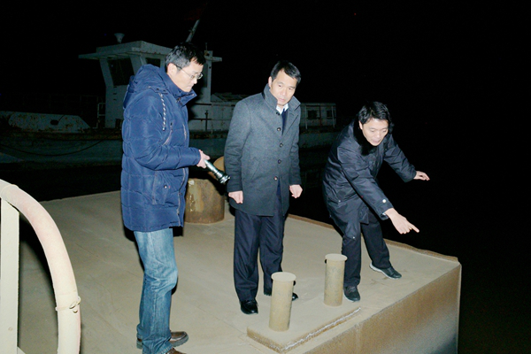 夜晚的黃河浮橋上冷風(fēng)刺骨,氣溫低達(dá)-8℃。馬貴鎖指揮長與龐濤處長根據(jù)浮橋結(jié)構(gòu),研究部署攔截壩敷設(shè)方法。全體突擊隊員與渭南市、合陽縣環(huán)保局工作人員從大卡車上卸下鋼絲繩、扳手、鉗子、活性炭包等器材器具,隨時準(zhǔn)備敷設(shè)攔截壩。