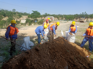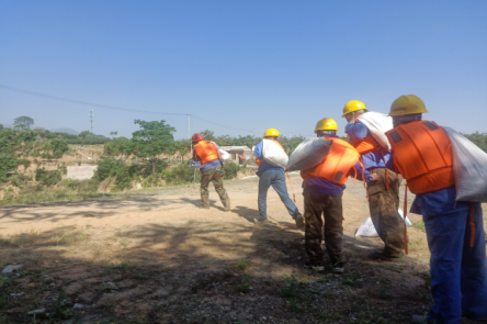 當(dāng)日上午8點(diǎn)整,秦太選廠組織相關(guān)參與人員在辦公樓前進(jìn)行集中,并對本次演習(xí)簡要講解。本次演習(xí)假設(shè)場景為連續(xù)強(qiáng)降雨,導(dǎo)致有洪水漫入庫內(nèi)并發(fā)現(xiàn)排洪渠內(nèi)有樹木雜草,庫內(nèi)水位不斷上升已接近警戒線,存在漫壩危險(xiǎn),需啟動應(yīng)急預(yù)案。演習(xí)地點(diǎn)為寺溝尾礦庫。演習(xí)內(nèi)容為監(jiān)測人員發(fā)現(xiàn)險(xiǎn)情及時上報(bào),興地公司立即啟動《尾礦庫生產(chǎn)安全專項(xiàng)應(yīng)急預(yù)案》,各單位、部門應(yīng)急救援隊(duì)員迅速集結(jié)、緊急增援。增援隊(duì)伍到達(dá)現(xiàn)場后,應(yīng)急搶險(xiǎn)分隊(duì)、警戒疏散組、物資保障組、技術(shù)支持組和醫(yī)療防護(hù)組分別按照各自的職能開展相應(yīng)工作。搶險(xiǎn)工作主要分為尾礦庫壩面人工堆積防洪壩,馬道排洪渠清除雜物,尾礦庫下游村莊村民疏散。
