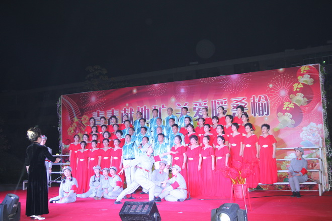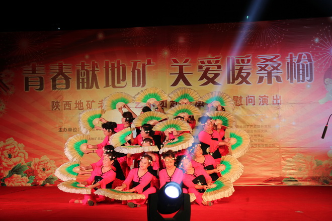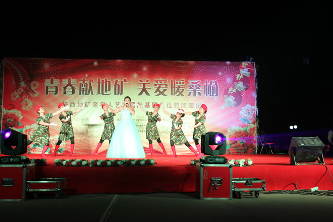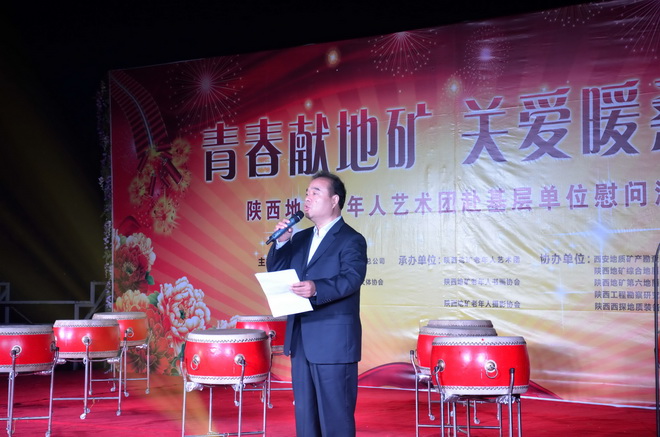 2015年10月19日下午十九點三十分由陜西省地質礦產開發總公司、陜西地礦總公司老年人文體協會主辦的“青春獻地礦 關愛暖桑榆”重陽節下基層慰問演出在我隊舉行??偣靖笨偨浝戆瑏喰?、副總工程師王根寶及總公司有關部門負責人、部分兄弟單位的領導、我隊領導班子成員一同觀看了演出。隊黨委書記王戰社發表了熱情洋溢的致辭。